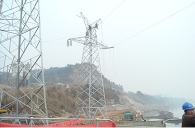 圖五:四川省強(qiáng)波電力工程有限公司在2005年承建的220KV大方變電站—110KV楊家橋變電站送電線路工程,圖為該工程按照標(biāo)準(zhǔn)化作業(yè)施工要求,按500KV—110KV線路驗(yàn)收規(guī)范要求,做好了安全防護(hù)工作,正在進(jìn)行N38號(hào)鐵塔附件安裝施工現(xiàn)場。
